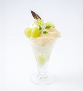 シャインマスカットと、芳醇な香りが魅力の青森産ゼネラルレクラークを贅沢に重ねた秋のプレミアムパフェ